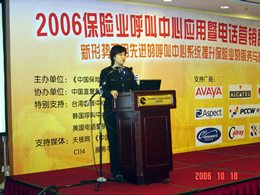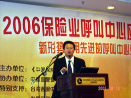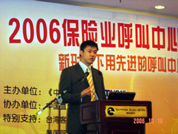 。。2006年10月18日,2006保險(xiǎn)業(yè)呼叫中心應(yīng)用暨電話營(yíng)銷(xiāo)高峰研討會(huì)在北京天鴻科園大酒店隆重召開(kāi),以下是大會(huì)主題演講的相關(guān)圖片報(bào)道: