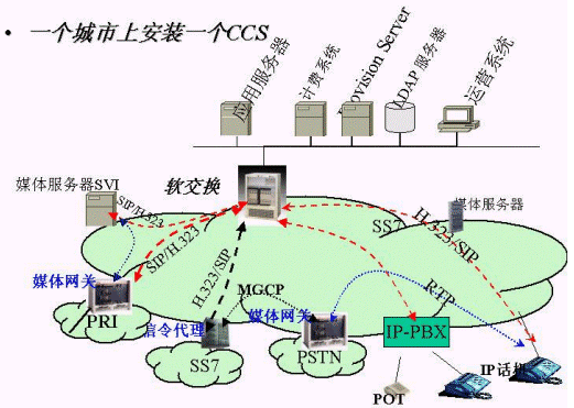 為了完整解決城域網(wǎng)上承載話(huà)音業(yè)務(wù),實(shí)現(xiàn)IP phone 到PSTN、IP phone 到 IP phone、PSTN 到IP phone的呼叫。新太公司的集成方案中包括以下設(shè)備:軟交換核心設(shè)備、媒體網(wǎng)關(guān)、信令網(wǎng)關(guān)、IP PBX、IP 話(huà)機(jī)、PC IP Softphone、媒體服務(wù)器。