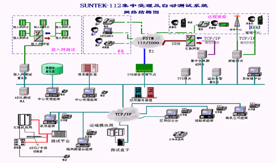 系統(tǒng)在設(shè)計時采用集中受理、分布測量的結(jié)構(gòu)化、模塊化設(shè)計:受理中心進行112的集中受理和業(yè)務處理,端局完成相應用戶線的測試功能,所有測試數(shù)據(jù)等均送至受理中心。系統(tǒng)測試準確、任務分擔、負荷均衡,處理速度快,性能可靠。系統(tǒng)的受理模塊和測試模塊相互協(xié)調(diào)又各自獨立,使二者可以統(tǒng)一地作為SUNTEKTM-112集中受理及自動測試系統(tǒng),又能各自作為子系統(tǒng)與其它廠家(112系統(tǒng)、97系統(tǒng)、1000號等)的產(chǎn)品結(jié)合起來為112系統(tǒng)服務。系統(tǒng)網(wǎng)絡(luò)結(jié)構(gòu)圖如下所示: