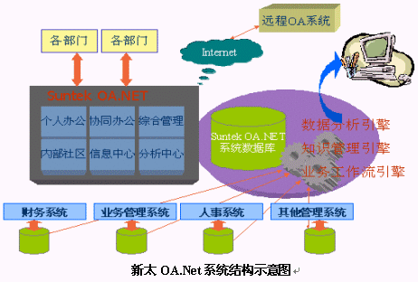 新太OA.NET系統(tǒng)采用B/S結(jié)構(gòu)設(shè)計(jì),系統(tǒng)以提供大量快速靈活的自定義功能以及許多核心平臺(tái)產(chǎn)品,如協(xié)同工作平臺(tái)、通訊平臺(tái)、知識(shí)管理平臺(tái)、信息服務(wù)平臺(tái)等,能夠幫助用戶快速實(shí)施信息化建設(shè),OA.NET系統(tǒng)的最大特色是實(shí)現(xiàn)"零代碼"維護(hù)功能,系統(tǒng)安裝后,無(wú)需編寫(xiě)任何代碼就可生成各種辦公業(yè)務(wù)應(yīng)用,用戶只需幾個(gè)小時(shí)的培訓(xùn)就可以使用OA.Net提供的工具進(jìn)行復(fù)雜辦公流程的設(shè)計(jì),并且可以不需要經(jīng)過(guò)任何編碼的改動(dòng),就能輕松適應(yīng)流程變化的新情況。另外,OA.NET強(qiáng)調(diào)對(duì)企業(yè)內(nèi)部知識(shí)的有效管理和有效利用,能夠沉積企業(yè)日常的零散信息,并通過(guò)有序歸類(lèi)的方式使之成為對(duì)企業(yè)有用的知識(shí)。OA.Net還提供了功能強(qiáng)大的個(gè)性化配置功能,每個(gè)員工都可以定制自己的界面風(fēng)格和功能模塊,并且可以自己建立個(gè)人的應(yīng)用環(huán)境,滿足個(gè)人的喜好。OA.Net包含了新太自主開(kāi)發(fā)的業(yè)務(wù)工作流處理引擎,能夠在不用編寫(xiě)代碼的情況集成其他業(yè)務(wù)系統(tǒng),實(shí)現(xiàn)了業(yè)務(wù)系統(tǒng)中的數(shù)據(jù)和辦公流程的完美結(jié)合,使得辦公應(yīng)用系統(tǒng)真正成為企業(yè)內(nèi)部的廣義化辦公門(mén)戶。