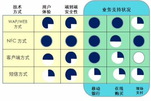 移動支付(Mobile payment)包括遠距離方式和近距離方式。遠距離移動支付的主要技術(shù)實現(xiàn)方式有SMS、WAP、客戶端(手機軟件)和USSD;近距離移動支付的主要技術(shù)實現(xiàn)方式有紅外和NFC。各種移動支付業(yè)務(wù)技術(shù)實現(xiàn)方式優(yōu)劣勢比較詳見圖表1。