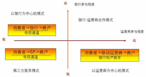 從產(chǎn)業(yè)鏈環(huán)節(jié)上看,移動支付的主要參與者主要包括:消費者、平臺提供商、銀行、運營商和商戶。其中,銀行和運營商在其中具有較高的談判能力。因此,可以按照這兩者在產(chǎn)業(yè)鏈中的參與程度,劃分移動支付的商業(yè)模式?偟膩碚f,銀行機構(gòu)管理著廣大用戶的資金帳戶,擁有完善的支付體系,在支付領(lǐng)域具有天然的用戶信任。運營商則擁有完備的網(wǎng)絡(luò)設(shè)施和先進的IT系統(tǒng),通過定制終端,運營商可以將各種先進的移動應(yīng)用提供給用戶,使用戶獲得良好的移動化生活體驗。因此,運營商在這方面具有較好的用戶資源和營銷渠道。