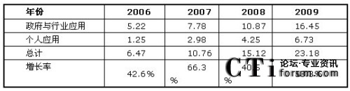 如圖1所示,F(xiàn)rost & Sullivan認(rèn)為,由于個(gè)人應(yīng)用領(lǐng)域的商業(yè)模式還未成熟,產(chǎn)業(yè)鏈整合仍在進(jìn)行中,目前移動(dòng)位置服務(wù)應(yīng)用仍然以政府和企業(yè)應(yīng)用為主。如圖4所示,2009年個(gè)人應(yīng)用市場(chǎng)規(guī)模為6.73億元,而政府與行業(yè)應(yīng)用市場(chǎng)達(dá)到16.45億元,兩者總計(jì)達(dá)23.18億元,同比去年增長(zhǎng)了53.3%。