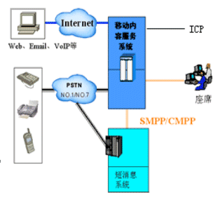 CTI技術(shù)是計算機(jī)電信集成技術(shù),它的信令網(wǎng)關(guān)化、媒體處理網(wǎng)關(guān)化、標(biāo)準(zhǔn)接口、可編程等特點(diǎn)非常適合移動內(nèi)容服務(wù)和聲訊服務(wù)的需求。因此,在移動內(nèi)容服務(wù)規(guī)范中,主要技術(shù)依據(jù)就是CTI技術(shù)和SMS技術(shù)。