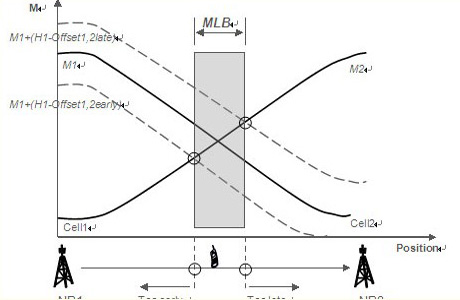 過早、過晚切換是由于目標(biāo)小區(qū)切換門限過低和過高所致。對應(yīng)過早和過晚臨界切換門限之間的區(qū)間就是合理的移動性優(yōu)化范圍。頻內(nèi)的負載均衡也可以通過調(diào)整切換門限值來引導(dǎo)用戶和負荷由高負荷小區(qū)遷移至低負荷小區(qū),很顯然可調(diào)的門限區(qū)間就是移動性優(yōu)化允許的范圍。這個范圍對應(yīng)相鄰小區(qū)的重覆蓋面積,在LTE中理論上大概相當(dāng)于正常小區(qū)面積的15%,可操作的價值不是很大。愛立信更傾向于異頻或者異系統(tǒng)的負荷均衡方案,增益比較明顯。如下圖,一個終端從左至右移動,M1、M2分別是接收到eNB1和eNB2的信號強度曲線,兩條曲線相交點對應(yīng)的地理位置處終端接收到的信號強度相同,對cell1到cell2的切換,下面的虛線對應(yīng)過早切換臨界,上面的虛線對應(yīng)過晚切換臨界,兩線與M2相交點對應(yīng)合理切換門限區(qū)間,也是頻內(nèi)負載均衡MLB的可調(diào)范圍。