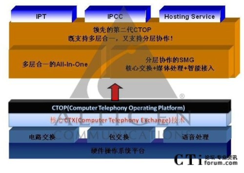 Telephony Operating Platform)平臺,在CTOP平臺設(shè)計中引入了核心交換、媒體處理與智能接入三層應(yīng)用架構(gòu)。在CTOP平臺上構(gòu)建呼叫中心系統(tǒng),既可兼容既有多層合一的All-In-One模式,也可采用分層協(xié)作的構(gòu)建模式,并適用于從小到大各種規(guī)模的呼叫中心!
