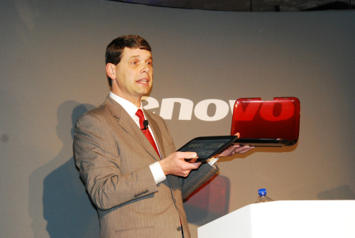 圖:聯(lián)想集團COO Rory Read向與會者展示聯(lián)想IdeaPad U1混合筆記本