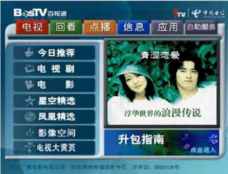 哈爾濱通信公司2004年下半年開始建設(shè)IPTV項目,"IPTV-百視通"是哈爾濱市通信公司和上海文廣新聞傳媒集團共同打造的互動電視業(yè)務(wù)品牌,UTStarcom作為系統(tǒng)和終端提供商提供了全套系統(tǒng)。"IPTV-百視通"業(yè)務(wù)不僅包含比傳統(tǒng)電視更豐富的頻道,更重要的是改變了傳統(tǒng)電視的收看方式,實現(xiàn)了"想看就看,想停就停"的收視夢想,同時提供大量精品電影、電視節(jié)目點播。