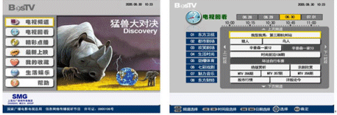 上海IPTV業(yè)務(wù)自2006年9月1日放號以來,發(fā)展十分迅速。截止10月7日,上海電信IPTV業(yè)務(wù)共計發(fā)展用戶達(dá)2.2萬。如下是上海IPTV商用系統(tǒng)EPG頁面: