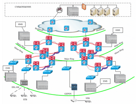 奔流(RollingStream)系統(tǒng)可以支持百萬級別的用戶規(guī)模,支持3級和多級部署架構(gòu)。包括中心節(jié)點(CMS)、區(qū)域匯聚節(jié)點(HMS)以及邊緣服務(wù)節(jié)點(EMS)。奔流(RollingStream)系統(tǒng)對于寬帶IP網(wǎng)絡(luò)的容忍度是很高的,可以支持各種網(wǎng)絡(luò)承載形式,也可支持各種接入方式。如LAN接入、DSLAM接入、GEPON接入。對于IPTV系統(tǒng),可建設(shè)專網(wǎng),CMS和HMS、EMS直接相連,也可以旁掛在城域網(wǎng)上。另外,無論PPPoE還是DHCP上網(wǎng)方式都可以支持。