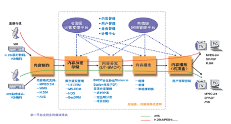 奔流(RollingStream)系統(tǒng)為IPTV業(yè)務(wù)提供了端到端的業(yè)務(wù)解決方案,先進(jìn)的系統(tǒng)架構(gòu)對Codec完全透明,可透明支持AVS,如下圖。奔流(RollingStream)系統(tǒng)包括內(nèi)容制作、內(nèi)容存儲/加密、內(nèi)容分發(fā)、內(nèi)容播放、終端顯示的各個方面,都可提供基于電信級的解決方案。