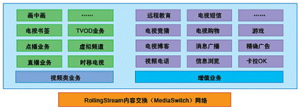 奔流(RollingStream)系統(tǒng)不僅僅支持以LiveTV、Timeshift-TV、VOD、TVOD等為基礎(chǔ)的各項功能,而且具有良好的功能上的可擴展性,在此平臺上可以支持眾多豐富多彩的增值互動業(yè)務(wù)。基于奔流(RollingStream)具有無限的業(yè)務(wù)增長空間,如下圖所示意: