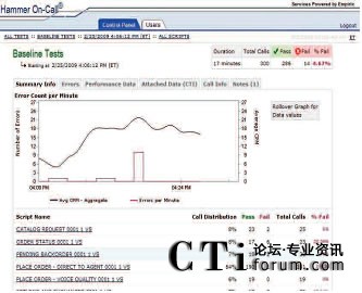 只需使用一個簡單易用的Web接入就可以和Empirix測試小組一起實時跟蹤測試進(jìn)度。此外,還同時可以查看測試結(jié)果、發(fā)生失敗的類型和導(dǎo)致失敗發(fā)生的測試流量。通話全程記錄功能可以用來記錄相關(guān)通話,從而捕獲和幫助診斷發(fā)生失敗的根源?梢詤⒖枷铝袌D表: