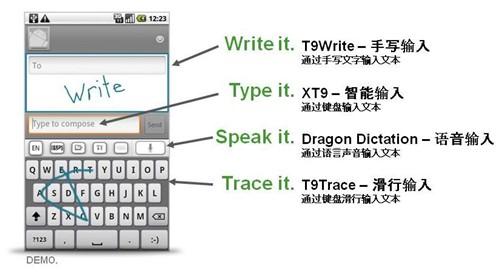 楊先生:Nuance T9 Trace解決了觸屏手機(jī)輸入文字的用戶體驗(yàn),適應(yīng)各種使用環(huán)境。另外,T9 Trace作為 XT9的插件,借助XT9的強(qiáng)大引擎提供周邊鍵盤自動的糾錯(cuò)功能,它可以會根據(jù)按鍵組合智能猜測您所需要輸入的文字。我們可以看到國內(nèi)好多手機(jī)的屏幕都非常小,2000元級別的手機(jī)屏幕大概是2.8英寸甚至2.5英寸,如果你要點(diǎn)命中的機(jī)會率更低了。所以滑行上來講可以某程度上解決這方面的問題。所以我們覺得這個(gè)滑行輸入法很有潛能的,特別是在中低端的Android平臺機(jī)型上。