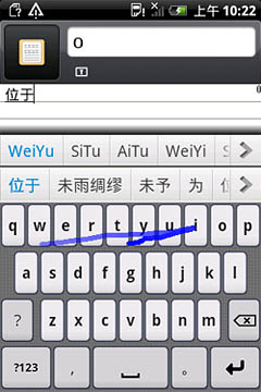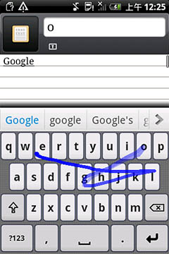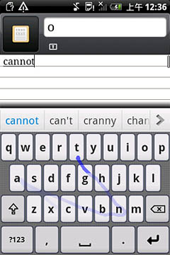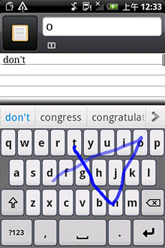 如圖所示,Nuance T9 Trace英文輸入方案對于各種不同的字母組合都能有效識別,像“google”這種既有連續(xù)又有間斷重復(fù)字母的單詞也不在話下,一次就能精準(zhǔn)輸出。另外,該輸入法還可以省去標(biāo)點(diǎn)符號,如“don"t”“can"t”等單詞,用戶只需滑觸“d-o-n-t”這四個(gè)字母,輸入法就會自動識別。