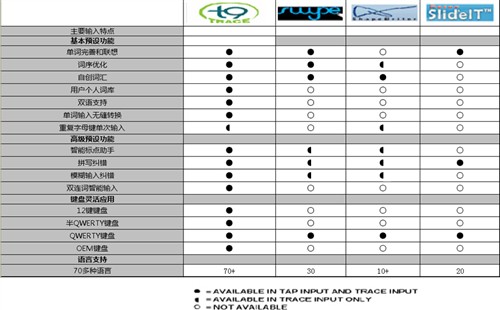 T9 Trace是Nuance T9產(chǎn)品組合中的一員,與T9、XT9、T9 Write等輸入技術(shù)共同為用戶打造多模式輸入體驗(yàn),使用戶擁有更多選擇,可以按照個(gè)人喜好輕松組合更快捷的輸入方法。T9 Trace憑借Nuance強(qiáng)大的語言數(shù)據(jù)庫,能夠支持多達(dá)70多種語言,是目前市面中支持語言最多的輸入技術(shù)。同時(shí),T9 Trace也是國內(nèi)首推的支持中文拼音(全拼輸入)的滑行輸入法。