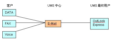 UMS的起源可追溯到數(shù)據(jù),傳真和語音三大應(yīng)用的整合,即統(tǒng)一為E-Mail形式,在企業(yè)內(nèi) 部或INTERNET郵件系統(tǒng)轉(zhuǎn)發(fā)。實現(xiàn)起來也較簡單,如下圖所示: