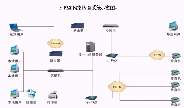 e-FAX網(wǎng)絡傳真機 的工作原理是利用內(nèi)部設備對傳真和語音信號的存儲及轉(zhuǎn)換功能,在網(wǎng)絡配置許可的范圍內(nèi) , 主要實現(xiàn)了自動接收和發(fā)送傳真的功能。系統(tǒng)內(nèi)用戶能通過電子郵件和網(wǎng)頁方式收取自己的傳真或語音,發(fā)送傳真時只需要提交傳真給傳真服務器,服務器能自動發(fā)送。系統(tǒng)外用戶能在語音流程的提示下發(fā)送或接收傳真,也可以選擇發(fā)送留言信息。系統(tǒng)管理員則可以對系統(tǒng)進行參數(shù)配置,流程定制和用戶信息管理等功能操作。