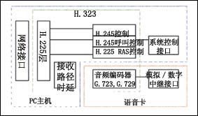用語音卡來搭建IP超市的核心在于如何用語音卡來搭建一個(gè)VoIP的語音網(wǎng)關(guān)。由于增加了VoIP功能,與傳統(tǒng)的CTI集成相比較,用語音卡來搭建一個(gè)VoIP的語音網(wǎng)關(guān),更富有挑戰(zhàn)性:語音卡除需要實(shí)現(xiàn)原有的模擬或數(shù)字電路接口外,還需要實(shí)現(xiàn)語音壓縮的編解碼、語音在IP網(wǎng)的傳輸協(xié)議以及解決好由此而產(chǎn)生的如回聲消除、靜音抑制、去時(shí)延抖動、QoS控制等問題。語音編碼標(biāo)準(zhǔn)一般要支持G.729、G.723等,目前國內(nèi)絕大多數(shù)VoIP網(wǎng)絡(luò)采用H.323協(xié)議棧,從兼容性考慮,用語音卡搭建的VoIP語音網(wǎng)關(guān)也應(yīng)采用H.323協(xié)議。其結(jié)構(gòu)如圖1所示。
