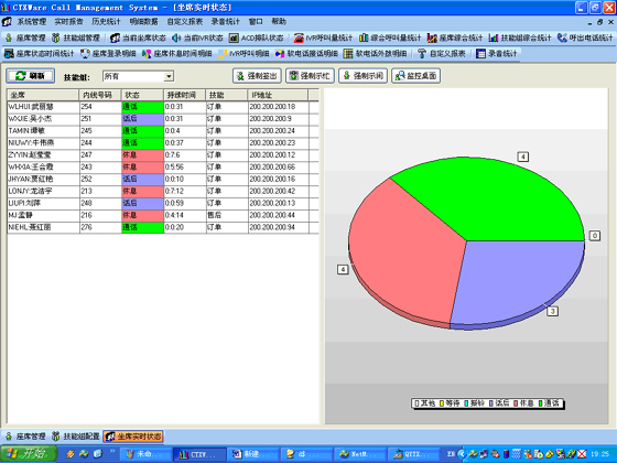 當(dāng)前座席狀態(tài):能夠提供座席的狀態(tài)表示,狀態(tài)持續(xù)時(shí)間,對(duì)應(yīng)的技能組,對(duì)應(yīng)的分機(jī)號(hào)碼,對(duì)應(yīng)的IP地址等信息?梢詫(duì)任何一個(gè)座席進(jìn)行強(qiáng)制簽出、強(qiáng)制示忙、強(qiáng)制示閑操作?梢詫(duì)任意座席進(jìn)行屏幕監(jiān)控操作(無(wú)需任何第三方軟件)。