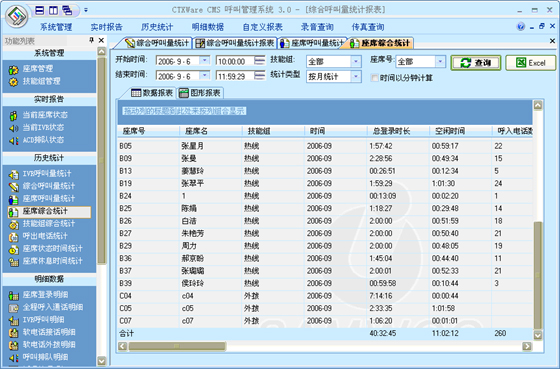 座席綜合統(tǒng)計(jì):可以根據(jù)“月份”、“天”、“小時(shí)”來(lái)統(tǒng)計(jì)每一個(gè)座席的綜合指標(biāo)。統(tǒng)計(jì)的指標(biāo)包括:總登錄時(shí)長(zhǎng)、空閑時(shí)長(zhǎng)、呼入電話數(shù)、呼入時(shí)長(zhǎng)、平均呼入時(shí)長(zhǎng)、呼出電話數(shù)、呼出時(shí)長(zhǎng)、平均呼出時(shí)長(zhǎng)、通話總數(shù)、通話總時(shí)長(zhǎng)、后處理時(shí)長(zhǎng)、平均后處理時(shí)長(zhǎng)、AUX總時(shí)長(zhǎng)、電話振鈴時(shí)長(zhǎng)、平均振鈴時(shí)長(zhǎng)、轉(zhuǎn)移次數(shù)、磋商次數(shù)、保持次數(shù)、平均保持時(shí)長(zhǎng)。