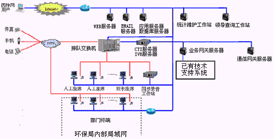 該12369環(huán)保熱線系統(tǒng)主要是由具有排隊功能的交換機或帶語音板卡的工控機、CTI服務器、IVR(交互式語音應答)/IFR(交互式傳真應答)子系統(tǒng)、人工座席子系統(tǒng)、應用服務器、數(shù)據(jù)庫服務器、業(yè)務網(wǎng)關子系統(tǒng)、通信網(wǎng)關子系統(tǒng)等硬件設備和應用軟件組成。