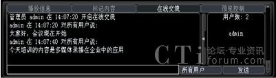 系統(tǒng)增加了多方文字互動交流功能,在線交流功能可以選擇給所有人員發(fā)送消息,也可以選擇給某一特定人員發(fā)送。這樣在會議或培訓(xùn)的過程中,管理員可以選擇性的提出相應(yīng)的問題給相關(guān)人員,考核相關(guān)人員的培訓(xùn)效果;其他人員也可以將會議或培訓(xùn)過程中遇到的疑問、難點(diǎn)及時(shí)的反應(yīng)給管理員進(jìn)行解答,增強(qiáng)會議或培訓(xùn)的成效。