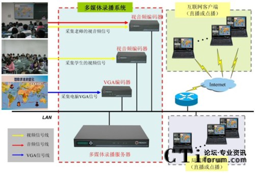 廣州市旅游職業(yè)學(xué)校多媒體錄播系統(tǒng)組網(wǎng)如上圖所示。在本項(xiàng)目中編碼器和多媒體錄播服務(wù)器分別部署在教室和機(jī)房?jī)?nèi),前端的視音頻編碼器采集老師、學(xué)生的視音頻信號(hào),VGA編碼器采集PPT內(nèi)容,編碼器采集信號(hào)并編碼后通過(guò)網(wǎng)絡(luò)發(fā)送給多媒體錄播服務(wù)器,多媒體錄播服務(wù)器接收并實(shí)現(xiàn)同步錄制、直播及事后點(diǎn)播。老師、學(xué)生可在教室、辦公室、宿舍等任何可以連接校園網(wǎng)的地方實(shí)時(shí)觀看教室內(nèi)進(jìn)行的課程,可滿足日常多媒體教學(xué)、課件錄制、微格教學(xué)等應(yīng)用的需要。