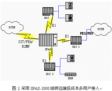 SPAS可編程交換機(jī)通過(guò)E1可以支持多個(gè)遠(yuǎn)端模塊。遠(yuǎn)端模塊采用SPAS-SAS框,可以帶多種用戶接口:普通模擬用戶、DDN、環(huán)路中繼用戶;通過(guò) SPAS主模塊對(duì)外提供各種信令接入。適合多點(diǎn)接入組網(wǎng),且組網(wǎng)成本低。組網(wǎng)圖見圖2: