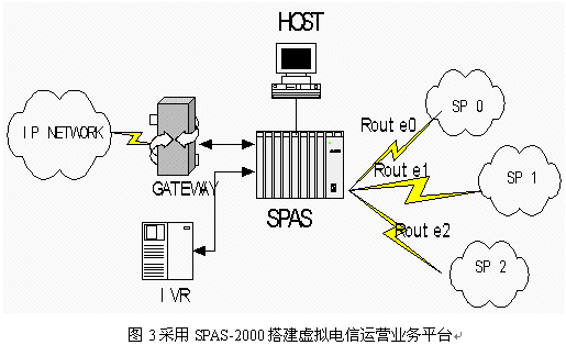 中國(guó)加入WTO后,國(guó)內(nèi)與國(guó)際的聯(lián)系、交流和溝通將會(huì)越來(lái)越頻繁,這一趨勢(shì)帶來(lái)了巨大的電信服務(wù)市場(chǎng)商機(jī)。同時(shí),國(guó)際電信企業(yè)正在尋求進(jìn)入中國(guó)的途徑,國(guó)內(nèi)新興的電信運(yùn)營(yíng)商積極應(yīng)對(duì)這種局面,而虛擬電信運(yùn)營(yíng)商也在國(guó)內(nèi)開始出現(xiàn)。如何爭(zhēng)取客戶是所有這些提供電信服務(wù)的企業(yè)共同面臨的課題。一個(gè)智能化的、高效的、靈活的、有特點(diǎn)并易于控制的服務(wù)平臺(tái)無(wú)疑是他們進(jìn)行競(jìng)爭(zhēng)的重要工具。由于SPAS-2000可編程交換機(jī)是一個(gè)全開放的靈活平臺(tái),用戶通過(guò)應(yīng)用程序幾乎可以完全控制交換,能很好的滿足用戶的需求。在此SPAS-2000可編程交換機(jī)上開發(fā)的電話批發(fā)及零售業(yè)務(wù)應(yīng)用,配合計(jì)算機(jī)技術(shù),能靈活控制業(yè)務(wù)的路由選擇、費(fèi)率計(jì)算并可提供個(gè)性化服務(wù),為運(yùn)營(yíng)商降低運(yùn)營(yíng)成本,提高服務(wù)質(zhì)量給出了有效的解決方案。例如一個(gè)IP電話運(yùn)營(yíng)商在全球互連中可能有多個(gè)合作伙伴,每個(gè)合作伙伴提供的服務(wù)也不相同,為了節(jié)省費(fèi)用并提高服務(wù)質(zhì)量,IP電話運(yùn)營(yíng)商需要根據(jù)時(shí)段、費(fèi)率、通話質(zhì)量、接通率等指標(biāo)智能選擇去話路徑。SPAS-2000可編程交換機(jī)提供編程開發(fā)接口,通過(guò)E1與IVR連接,在服務(wù)器上開發(fā)高層應(yīng)用軟件,可以實(shí)現(xiàn)多種高級(jí)功能。同時(shí)SPAS還可以連接各種型號(hào)的網(wǎng)關(guān)。應(yīng)用連接圖見圖3: