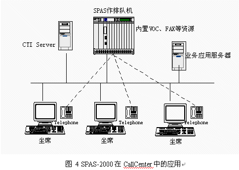 目前國(guó)內(nèi)呼叫中心的建設(shè)方興未艾,企業(yè)為了改善服務(wù),贏得客戶,紛紛建設(shè)自身的呼叫中心。如果建立呼叫中心全部采用國(guó)外設(shè)備,價(jià)格非常昂貴,使很多客戶望而卻步。這樣大的投資目前也只有電信(包括移動(dòng)和聯(lián)通)、電力、銀行等資金充裕的行業(yè)才能承受。而且,根據(jù)我方了解,即使這些行業(yè)也在控制采購(gòu)成本,原先只注重名牌,不計(jì)成本的情況正在改變。而在目前宏觀經(jīng)濟(jì)形勢(shì)不景氣的大背景下,大中型企業(yè)既要加快企業(yè)信息化建設(shè),保住客戶,降低成本,又要精打細(xì)算,規(guī)避投資風(fēng)險(xiǎn)。我們掌握建立呼叫中心設(shè)備的所有核心技術(shù),因此在呼叫中心應(yīng)用方面有很大的價(jià)格優(yōu)勢(shì),這樣就降低了擁有呼叫中心的門檻,在這個(gè)市場(chǎng)上也有很強(qiáng)的競(jìng)爭(zhēng)力。采用SPAS-2000可編程交換機(jī)支持智能業(yè)務(wù)通用編程接口,可以作為CallCenter核心設(shè)備,應(yīng)用圖見圖4: