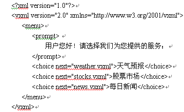 目前人們對(duì)HTML已經(jīng)很熟悉,類(lèi)似于用于Web網(wǎng)頁(yè)標(biāo)記的HTML,VoiceXML是為語(yǔ)音應(yīng)用制訂的語(yǔ)音可擴(kuò)展標(biāo)記語(yǔ)言。VoiceXML使公用電話(huà)網(wǎng)與互聯(lián)網(wǎng)的結(jié)合體現(xiàn)在三個(gè)方面:語(yǔ)音瀏覽器的使用,互聯(lián)網(wǎng)和公用電話(huà)網(wǎng)的信息共享,以及類(lèi)似于Web網(wǎng)頁(yè)開(kāi)發(fā)過(guò)程的語(yǔ)音應(yīng)用系統(tǒng)的開(kāi)發(fā)。