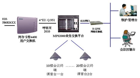 該會(huì)議系統(tǒng)通過4個(gè)數(shù)字中繼,與國電原有的阿爾卡特4400用戶交換機(jī)互連,通信采用Q.931信令。4路4線實(shí)現(xiàn)會(huì)議終端的接入,現(xiàn)使用3路,1路接國電10樓的調(diào)音臺,2路接20樓的調(diào)音臺,實(shí)現(xiàn)會(huì)議室擴(kuò)音設(shè)備的接入。通過以太網(wǎng)口與D-LINK網(wǎng)絡(luò)交換機(jī)互連,接入國電集團(tuán)的局域網(wǎng),實(shí)現(xiàn)維護(hù)管理及會(huì)議控制等功能。國電集團(tuán)的會(huì)議接入號為:010-586826XX,因原有交換機(jī)的功能局限,以該接入號到交換機(jī)后自動(dòng)呼轉(zhuǎn)到2010進(jìn)入MPS2000會(huì)議系統(tǒng),實(shí)現(xiàn)會(huì)議的呼入。