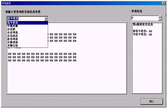 通道監(jiān)控:在監(jiān)控欄中顯示0~89個(gè)通道,每個(gè)通道對(duì)應(yīng)一個(gè)用戶,當(dāng)用戶撥接入號(hào)入會(huì)時(shí),用戶自動(dòng)占用一個(gè)通道,用光標(biāo)移至該通道時(shí)它自動(dòng)地打開提示欄,里面顯示該用戶的主叫號(hào)碼、級(jí)別。