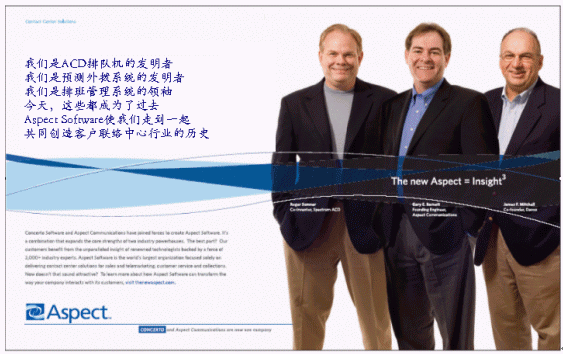 非常感謝您對(duì)科勝通軟件(Aspect Software)中國公司的支持,經(jīng)過一系列的收購與合并,全球呼叫中心呼入技術(shù)的發(fā)明者,全球呼叫中心呼出技術(shù)的發(fā)明者,全球一體化聯(lián)絡(luò)中心系統(tǒng)的締造者,全球勞動(dòng)力管理排班系統(tǒng)的領(lǐng)導(dǎo)者,在世界高新技術(shù)飛速發(fā)展的今天,歷史性的走到了一起,誕生了全新的世界級(jí)呼叫中心的巨輪Aspect