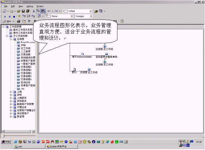 該產(chǎn)品通過(guò)將所有業(yè)務(wù)分別處于樹(shù)形化的節(jié)點(diǎn)上,可以直觀的對(duì)業(yè)務(wù)進(jìn)行增加、刪除、修改的管理。增加子業(yè)務(wù)的時(shí)候,必須帶有業(yè)務(wù)類(lèi)別,實(shí)現(xiàn)業(yè)務(wù)管理歸類(lèi)化,避免業(yè)務(wù)管理的混亂。該產(chǎn)品還支持業(yè)務(wù)流程的樹(shù)形化表示,使業(yè)務(wù)流程開(kāi)發(fā)者可以方便地了解業(yè)務(wù)流程的全局框架。