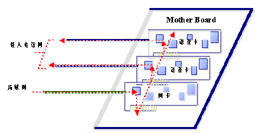 通過(guò)局域網(wǎng)傳遞語(yǔ)音數(shù)據(jù)本來(lái)就不能保證其時(shí)實(shí)時(shí)性,其結(jié)果就是用戶聽(tīng)到的語(yǔ)音經(jīng)常斷續(xù),保證不了語(yǔ)音質(zhì)量。如果傳遞的語(yǔ)音數(shù)據(jù)是經(jīng)過(guò)壓縮的,語(yǔ)音數(shù)據(jù)本來(lái)就是通過(guò)TTS進(jìn)行合成的,再經(jīng)過(guò)壓縮,則音質(zhì)會(huì)有很大的損傷,因此同樣保證不了語(yǔ)音質(zhì)量。從上圖中我們可以看到,經(jīng)TTS合成的語(yǔ)音數(shù)據(jù)從局域網(wǎng)經(jīng)過(guò)網(wǎng)卡,再通過(guò)主板PCI(或ISA)總線進(jìn)入語(yǔ)音卡,最后進(jìn)入電信網(wǎng),同樣語(yǔ)音數(shù)據(jù)通過(guò)計(jì)算機(jī)主板經(jīng)PCI(或ISA)總線進(jìn)入語(yǔ)音卡也要求是實(shí)時(shí)的。這兩種實(shí)時(shí)性的要求會(huì)導(dǎo)致在接入量比較大的情況下,會(huì)給計(jì)算機(jī)的總線造成很大的負(fù)擔(dān)。因?yàn)榭偩的帶寬(數(shù)據(jù)吞吐量)是有限的。況且其它的板卡和接口(如聲卡、顯示卡等)也要直接或間接地占用總線。因此在接入量比較大的情況下,計(jì)算機(jī)的總線帶寬會(huì)成為一個(gè)比較關(guān)鍵的瓶頸。即便提高語(yǔ)音板卡的接入能力。在有大量電話接入的情況下,由于語(yǔ)音數(shù)據(jù)實(shí)時(shí)性的要求,也不能保證語(yǔ)音質(zhì)量。