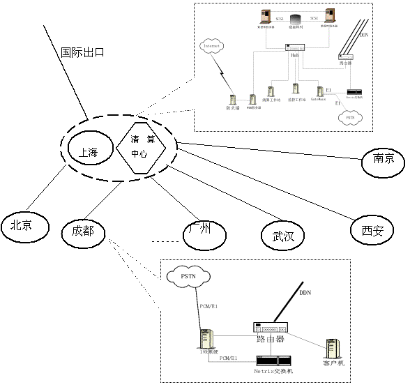 數(shù)據(jù)網(wǎng)絡(luò)為DDN專(zhuān)線構(gòu)成的Intranet,該Intranet在國(guó)內(nèi)可以有一個(gè)以上的國(guó)際出口。并通過(guò)防火墻同Internet連接。語(yǔ)音/數(shù)據(jù)的傳輸采用網(wǎng)絡(luò)交換設(shè)備。
