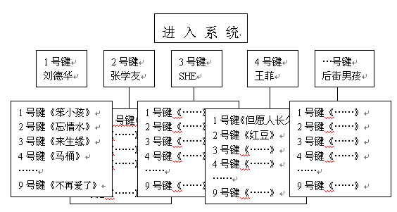 眾所周知,目前大多數(shù)電話機(jī)和手機(jī)的操作鍵盤都只有0-9十個數(shù)字鍵和*號和#號兩個符號鍵,因此在設(shè)計導(dǎo)航菜單的時候很受限制。比如在點(diǎn)歌節(jié)目中,用這些數(shù)字鍵來指代上千首歌曲是根本不可能的。以前多采用的方法有兩種:一是預(yù)先給用戶發(fā)送歌曲手冊,上面可以查到每首歌曲的代號。這種方式的缺點(diǎn)是實時性差,不能隨時更新歌曲庫。另外印刷宣傳資料帶來的人力和成本也不容忽視;另一種方法是將歌曲根據(jù)歌手、主題進(jìn)行分類,比如下圖所列的結(jié)構(gòu):