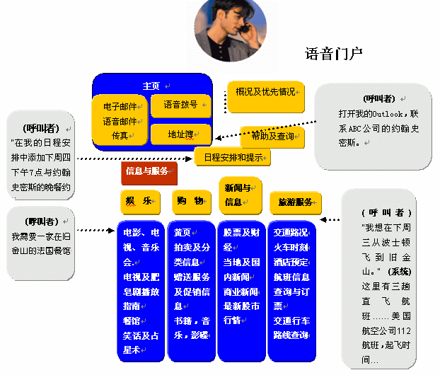 基于在語音識別技術(shù)準(zhǔn)確度上已有突破性的進(jìn)展,因此可以利用語音,不僅僅是改變原有的鍵盤輸入查詢方式,而且能夠使自動應(yīng)答系統(tǒng)處理更加復(fù)雜的情況。用戶撥打服務(wù)電話的時候,只需說出他/她的需求即可。如在電子黃頁業(yè)務(wù)中,用戶要查詢關(guān)于A公司的情況,服務(wù)電話接通以后就可以直接說出"A公司",而不要按鍵通過一層層的菜單目錄,然后系統(tǒng)就能自動播報出該單位介紹信息和聯(lián)系方式等。
