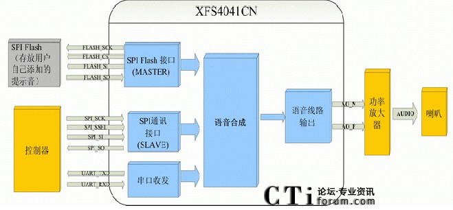 XFS4041CN是科大訊飛公司新推出的一款高性能中文語音合成芯片,可以通過UART或 SPI 接口接收待合成的文本,將文本合成為清晰流暢的語音輸出。XFS4041CN 語音合成芯片是由雙芯片構(gòu)成的套片,支持六種發(fā)音風(fēng)格,可通過軟件調(diào)節(jié)語速、語調(diào)、音量,支持多種文本控制標(biāo)記。芯片接口簡單、功能豐富,主要面向中高端應(yīng)用領(lǐng)域,為用戶提供了一套高性價比的語音解決方案。
