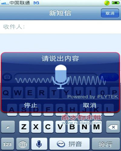 錄入結(jié)束后,點(diǎn)擊“停止”,輸入法會自動開始對剛才錄入的語音進(jìn)行識別。需要注意的是,這個時候只有通暢的3G網(wǎng)絡(luò)或者W IFI網(wǎng)絡(luò),才能順利識別;如果信號欄顯示“E”或者“O”,都將無法得到正確識別,也無法錄入短信內(nèi)容。