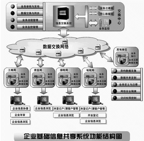 以下是企業(yè)基礎(chǔ)信息交換與共享系統(tǒng)的功能結(jié)構(gòu)示意圖。
