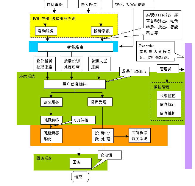 黎明網(wǎng)絡(luò)深入研究世界上最新的CTI技術(shù)的發(fā)展和應(yīng)用,自主研發(fā)推出的12315消費(fèi)者投訴受理系統(tǒng)采用當(dāng)前主流的一體化的呼叫中心模式。一體化的呼叫中心模式具有投資少、易于實(shí)施、維護(hù)工作量較小、維護(hù)成本低的優(yōu)點(diǎn)。該系統(tǒng)建立在內(nèi)部以太網(wǎng)基礎(chǔ)上,不同網(wǎng)絡(luò)(PSTN網(wǎng)、IP網(wǎng)、GSM/GPRS/CDMA網(wǎng))的消費(fèi)者可以通過(guò)多種方式(電話、傳真、E-mail、短消息等)接入12315系統(tǒng),利用系統(tǒng)提供的服務(wù)進(jìn)行投訴舉報(bào)或咨詢(xún)。