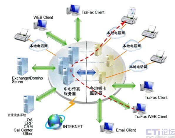 Server板卡服務(wù)器都將通過Internet或企業(yè)網(wǎng)絡(luò)而相互連接起來,協(xié)同工作, 共同分擔(dān)工作負(fù)荷, 共享資源和傳真信道。這樣傳真也是被傳遞到離目的地最近的板卡服務(wù)器后才發(fā)送出去,從而將國際,國內(nèi)傳真費(fèi)用減少為本地傳真費(fèi)用。