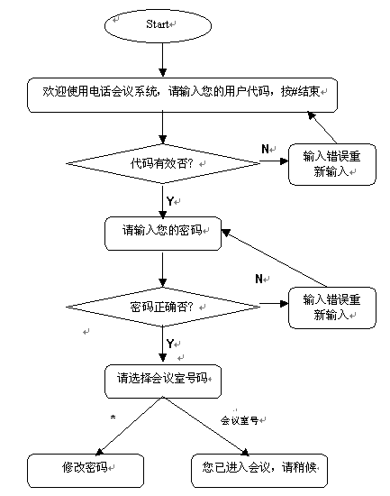 說(shuō)明:用戶(hù)代碼、密碼等電話(huà)會(huì)議資料管理員可以通過(guò)客戶(hù)端管理系統(tǒng)來(lái)建立。該語(yǔ)音流程也可以通過(guò)Smatele語(yǔ)音流程生成器來(lái)改寫(xiě),方法為在Server端執(zhí)行程序的當(dāng)前路徑下編寫(xiě)一個(gè)名為User.dat的語(yǔ)音流程腳本文件即可,具體方法可以參閱《SmarTele流程生成器說(shuō)明》和user_con.dat說(shuō)明;