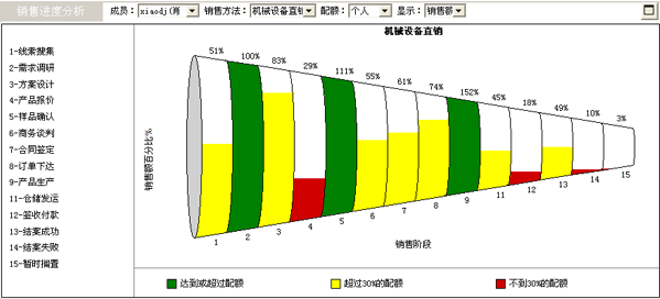 如果缺乏可預(yù)見的銷售進(jìn)程管理,企業(yè)的銷售目標(biāo)將難以順利實(shí)現(xiàn);手工的、基于結(jié)案的銷售收入統(tǒng)計(jì)造成的滯后性,降低了企業(yè)靈活應(yīng)對復(fù)雜多變市場的能力。幸好,CRM軟件提供了一套經(jīng)典的銷售進(jìn)程可視化管理工具,它包括銷售管道圖和銷售預(yù)測圖等。