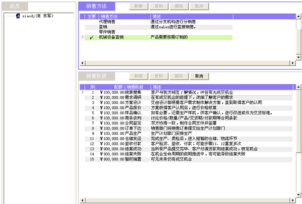 一套好的CRM軟件,應(yīng)當(dāng)同時(shí)支持多種銷售方法。例如,精密機(jī)械制造行業(yè),有可能同時(shí)需要支持四種銷售方法:標(biāo)準(zhǔn)整機(jī)銷售方法、項(xiàng)目型整機(jī)銷售方法、零件及有償服務(wù)銷售方法、三包件等。每個(gè)銷售方法都有對應(yīng)的銷售流程。以圖2為例,我們看到"機(jī)械設(shè)備直銷"的銷售方法,對應(yīng)著15個(gè)銷售階段,每個(gè)階段都可通過簡述來明確該階段典型的業(yè)務(wù)特征、成交可能性的區(qū)間,以便銷售代表在操作記錄的時(shí)候擁有共識。
