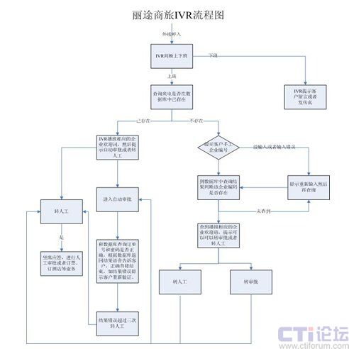麗途商旅呼叫中心整個(gè)呼叫流程是:客戶通過全國400電話呼入系統(tǒng),IVR自動(dòng)應(yīng)答,根據(jù)客戶來電號(hào)碼通過URL的方式和業(yè)務(wù)系統(tǒng)數(shù)據(jù)庫進(jìn)行查詢該來電號(hào)碼是否是老客戶,然后直接播報(bào)客戶對應(yīng)的企業(yè)名稱和麗途的歡迎語,客戶可以進(jìn)行訂單的審批和密碼驗(yàn)證或者轉(zhuǎn)人工服務(wù);如果是來電號(hào)碼在數(shù)據(jù)庫中不存在,IVR系統(tǒng)提示客戶輸入企業(yè)編號(hào)或者轉(zhuǎn)接人工服務(wù),輸入企業(yè)編號(hào)還會(huì)在數(shù)據(jù)庫中查詢是否是已存在客戶并執(zhí)行相應(yīng)的流程,如是新客戶那么就會(huì)轉(zhuǎn)接人工服務(wù),由人工來進(jìn)行訂單的制定、審批,密碼驗(yàn)證等工作。
