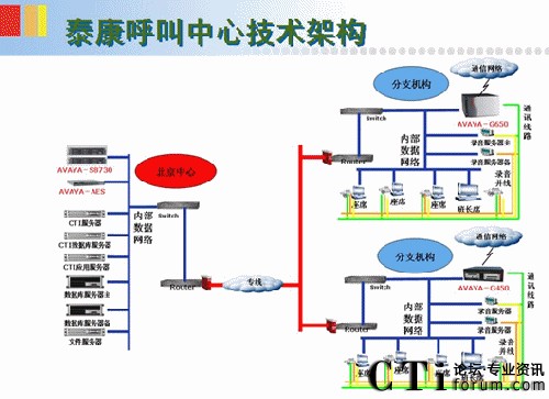 泰康電銷中心采用交換機(jī)+CTI+錄音+應(yīng)用系統(tǒng)組成。在中心點(diǎn)普遍采用交換機(jī)模式。當(dāng)中心點(diǎn)坐席規(guī)模大于60席位以數(shù)字中繼模式接入。當(dāng)分點(diǎn)新建數(shù)量不足60座席時(shí),采用遠(yuǎn)端模式,相應(yīng)采用交換機(jī)遠(yuǎn)端模塊+CTI+錄音+應(yīng)用系統(tǒng)組成。
